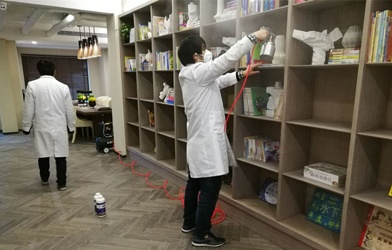 針對污染源頭、污染物的種類、空間結構特點,我公司采用技術與施工人員采用了高壓噴槍均勻噴涂、高溫氣體熏蒸等兩種施工技術,高壓噴槍噴灑均勻,細膩,適用于墻面、地板、家具表面的作業,而高溫熏蒸適用于不易滲透的材質,如板材、地毯等,針對污染物種類,我公司先后使用了納米光觸媒、甲醛清除劑、異味清除劑、苯清除劑等高效率除污染產品,針對不同的污染物、污染源,使用不同的產品,對粉刷的墻面,貼墻紙的墻面,使用利純納米光觸媒,進行甲醛清除,這些地方光照量較充足,便于光觸媒對甲醛的分解,對于辦公家具、書桌、儲物柜、地板等污染重災區,采用甲醛清除劑進行處理,針對地毯使用、裝飾物使用異味清除劑,針對不同污染物,做分別處理。在每一遍施工中,我們不放過任何一個可能釋放甲醛的污染源頭,施工時輕拿輕放,施工后將所有物品回歸原位,良好的施工態度得到了相關負責人的肯定。施工取得了圓滿成功。